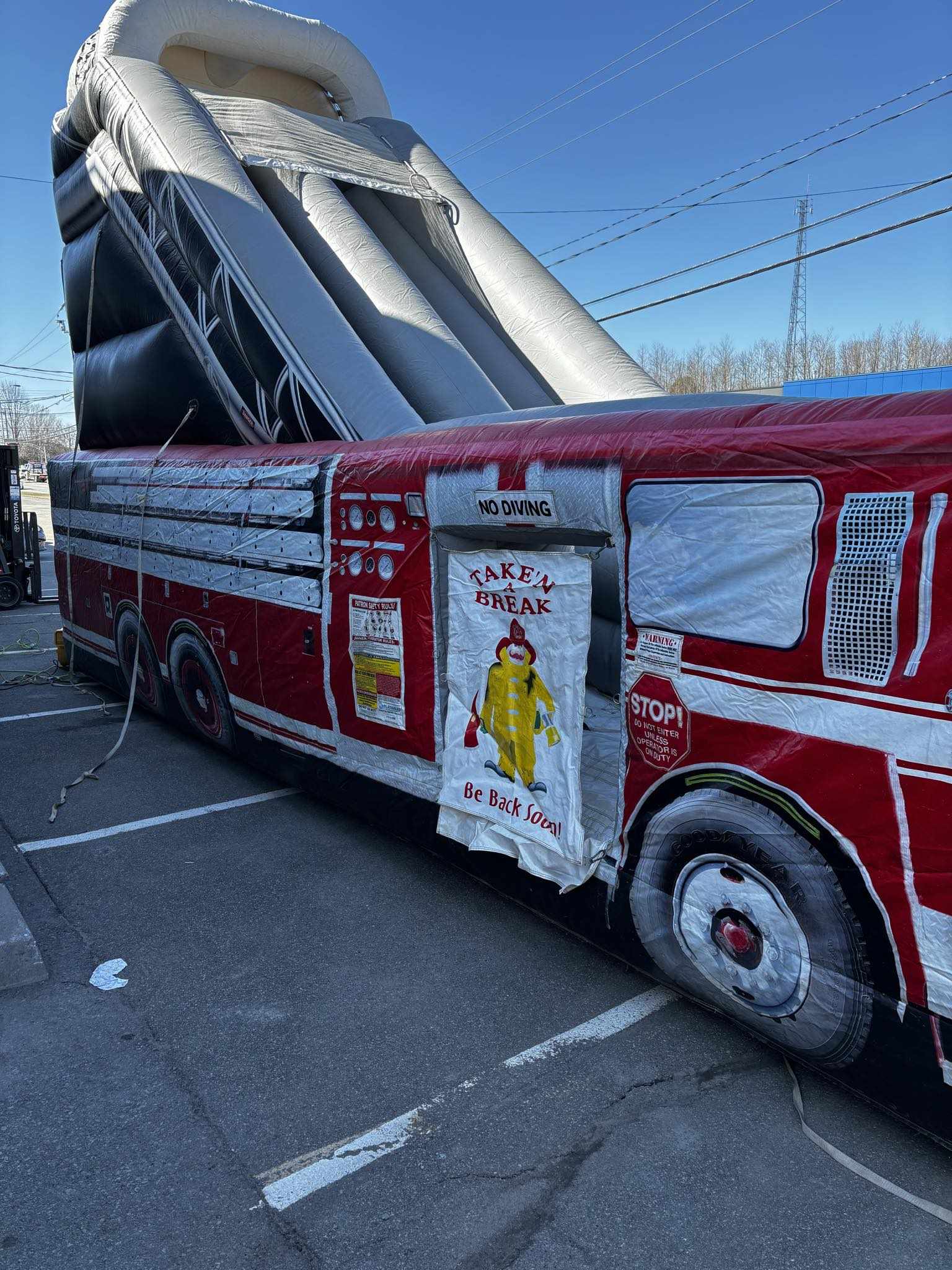 Monte à bord du camion de pompier. Les enfants grimpent comme de vrais héros, puis whoooosh, ils glissent en mission pour éteindre l’ennui. Un classique qui met le feu à n’importe quelle fête.