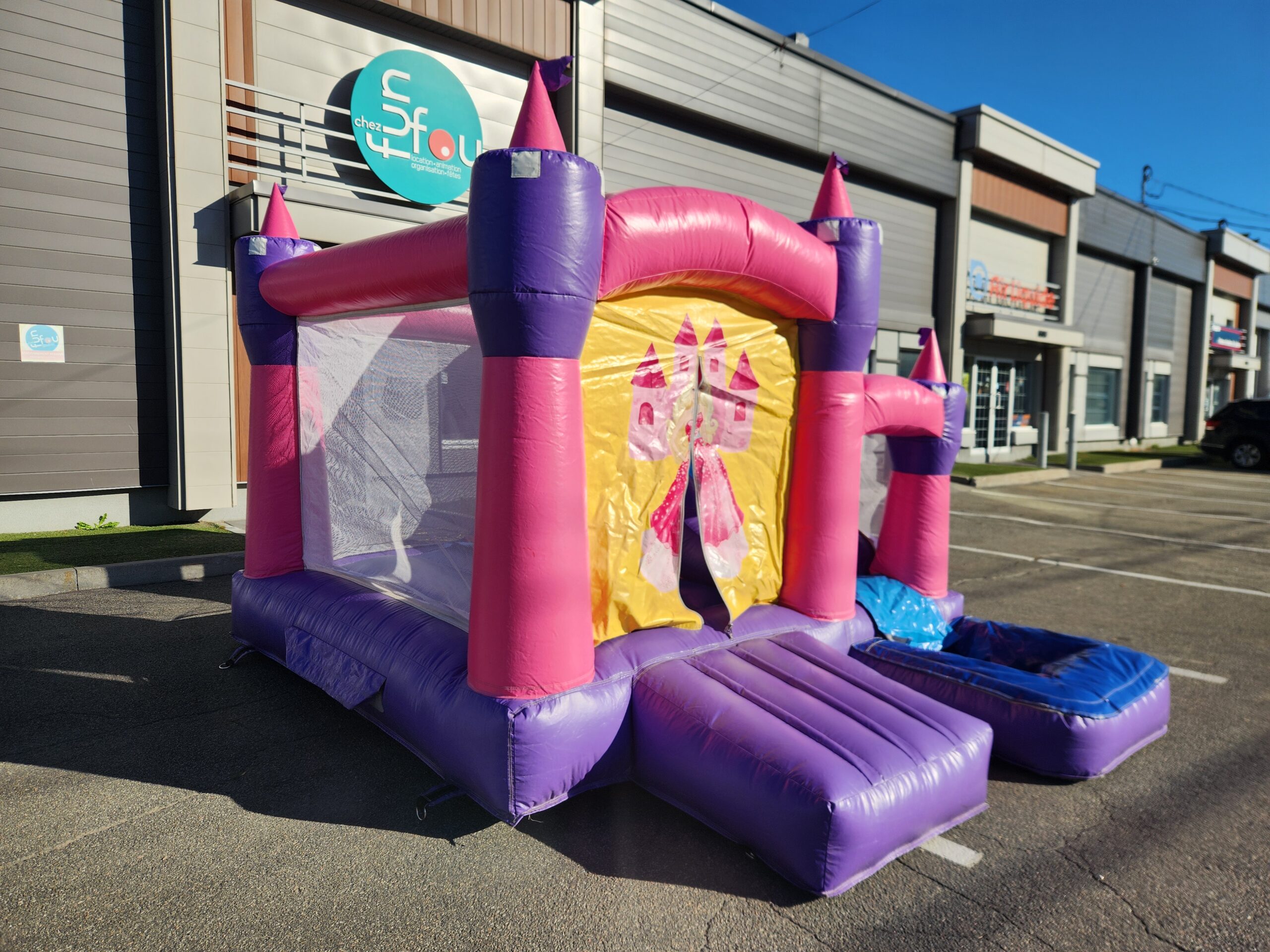 Un château qui comprend un sautoir, un mur d’escalade et une glissade qui mène directement dans un petit bassin d’eau, c’est idéal pour les princes et princesses !
