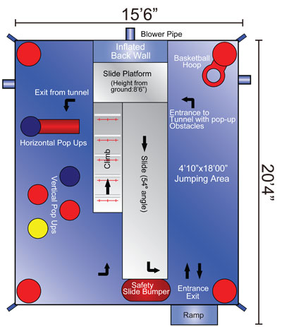 Du plaisir au pied carré, ça se retrouve dans le Combo Multi Cinq ! Un grand espace pour sauter, un panier de basketball, une grande glissade, un mur d’escalade, pleins d’obstacles et tout ça, dans un seul jeu gonflable !